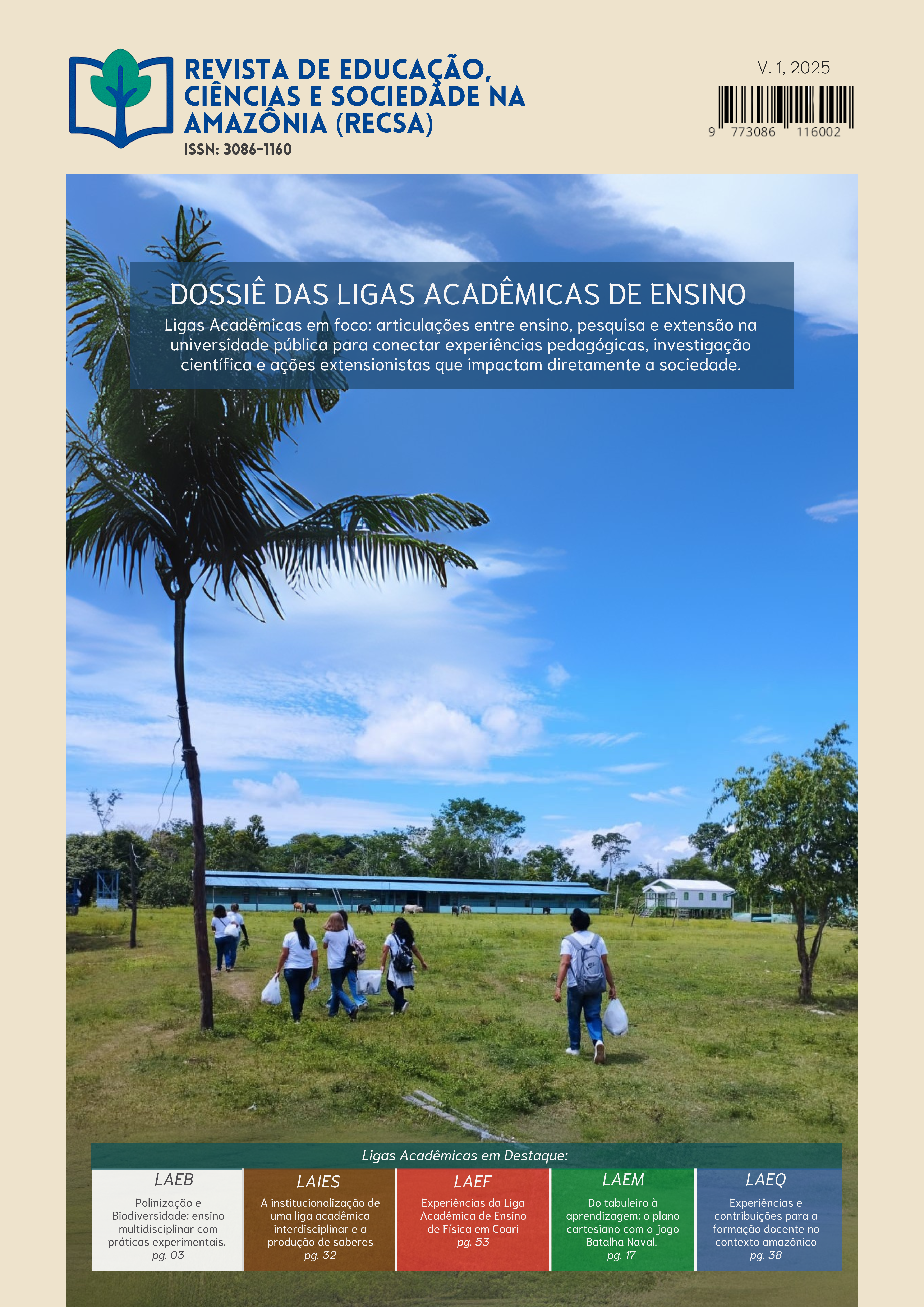 v. 1 (2025)Esta edição da RECSA apresenta o dossiê “Ligas Acadêmicas de Ensino”. Nossa missão se firma na divulgação de experiências que aproximam ensino, pesquisa e extensão dentro do cenário amazônico. Os textos abordam trajetórias de ligas, antes concentradas no campo da saúde, e mostram ainda expansão para áreas voltadas à formação docente. Esse movimento expõe um conjunto de práticas que ajudam a criar saberes profissionais, favorecem experimentações pedagógicas e ampliam o vínculo entre universidade e comunidade. A diversidade das ligas chama atenção. Cada grupo trabalha com temas próprios, mas todos buscam uma formação que faça sentido para os estudantes e para as escolas do território. A interdisciplinaridade ganha força nesse processo, assim como o protagonismo estudantil, que aparece de forma clara nas ações desenvolvidas. As atividades geram impacto formativo, estimulam tomada de decisão, leitura crítica do próprio percurso e inserção ativa em espaços de diálogo sobre ensino e aprendizagem. O dossiê também destaca desafios que ainda travam o avanço dessas iniciativas. Incentivo, financiamento e reconhecimento institucional seguem frágeis. As ligas crescem, mas dependem de esforços contínuos de docentes e discentes que assumem a organização do trabalho sem garantia de apoio regular. A consolidação exige postura firme da universidade, pois o alcance social dessas ações já se mostrou expressivo.